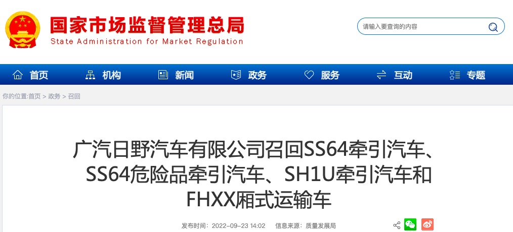 日前,广汽日野汽车有限公司根据《缺陷汽车产品召回管理条例》、《缺陷汽车产品召回管理条例实施方法》和《机动车排放召回管理规定》的要求,向国家市场监督管理总局备案了召回计划。决定自即日起,召回2020年6月16日至2022年6月17日期间生产的SS64牵引汽车、SS64危险品牵引汽车、SH1U牵引汽车和FHXX厢式运输车,共计408辆,具体如下: