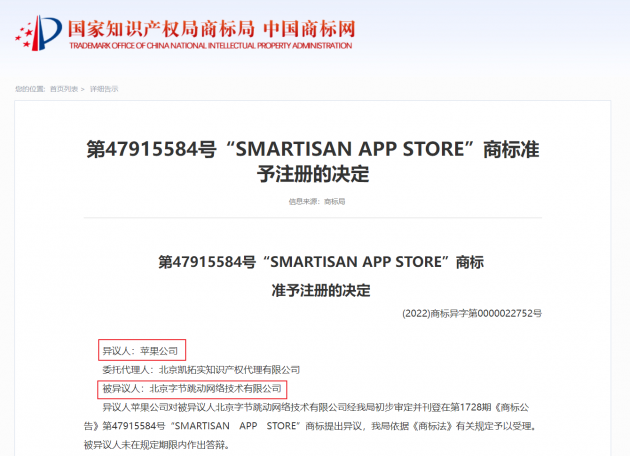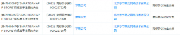 4 月 25 日消息,近日,第 47915584 号、47916999 号、47919847 号Smartisan App Store商标准予注册的文书公开,苹果公司对北京字节跳动网络技术有限公司的商标注册提出异议,国家知识产权局商标局不予支持。