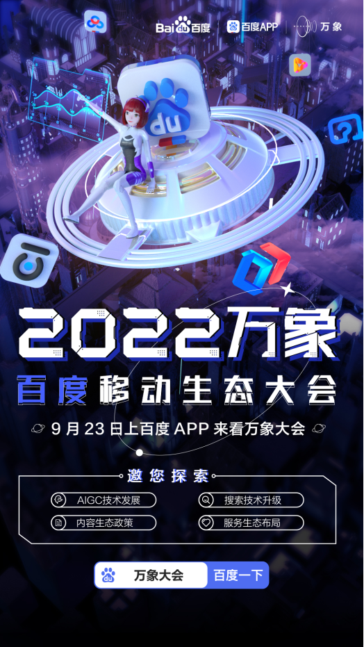 9月23日,2022万象·百度移动生态大会(后简称“万象大会”)将在广东珠海召开。百度集团资深副总裁、百度移动生态事业群组(MEG)总经理何俊杰将携各业务板块负责人亮相,解读百度移动生态建设成果和战略升级,展示百度在AIGC、搜索等领域的技术革新,知名经济学家任泽平等行业专家也将齐聚现场,分享AI技术带来的新一轮经济增长红利。同时,百度移动生态各业务板块将发布多项战略计划和扶持政策,全面助力创作者及生态合作伙伴成长。