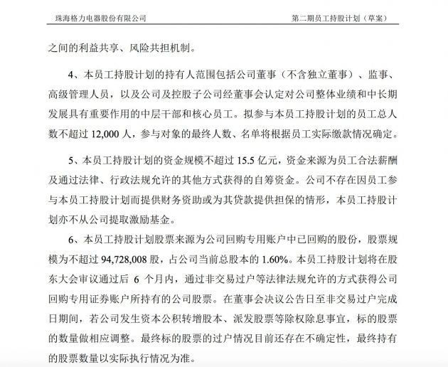 格力电器公布第二期员工持股计划:资金规模不超15.5亿元1.2万人受益