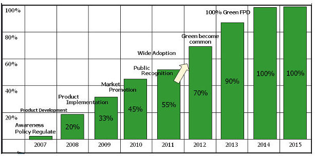 根据DisplaySearch副总裁以及Green FPD研究小组召集人谢勤益观察,以电力消耗的角度来看,在所有用到面板的计算机或消费性产品之中,面板是最高电能消耗的组件产品,因此即使在全球经济景气有所疑虑的状况之下,仍在终端市场发现,消费者反而越重视绿色环保产品与技术。换言之,无论经济景气如何,绿色面板都将是未来十年显示器业界的最热门话题,也将改变整个面板上下游的生态。