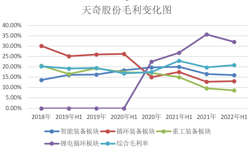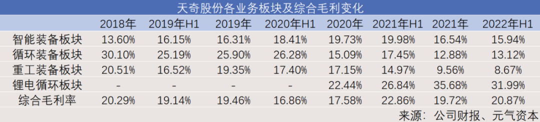 不过,在其锂电循环板块高毛利的带动之下,天奇股份综合毛利率在随后的两年里重新上升至2022年H1的20.87%。在此期间,其锂电循环业务产能充分释放的带动下毛利率从2020年的22.44%快速上升至30%以上,也扭转了包括智能装备板块在内的其余三块业务毛利持续下降带给其综合毛利的负面影响。
