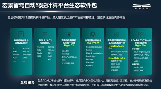 宏景智驾的智驾产品应用面向SOA的软件架构,具备高性能、易移植特性的同时,可以支持软硬分离及云端协同迭代、模块可复用与重组,加以宏景智驾自研工具链和数据平台作为研发与测试阶段的支持,可以为主机厂客户带来高成长性的全栈服务。