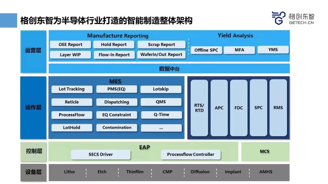格创东智提供的CIM系统方案包括核心MES(生产执行系统)、EAP(设备自动化)、YMS(良率管理系统)、SPC(统计过程控制)、RMS(工艺配方管理)、FDC(故障缺陷分类)、MCS(物料搬运系统)、数据中台等,提供全方位的半导体智造(晶圆/封测)一站式的解决方案,帮助企业客户改善产品良率、提高品质和生产效能。