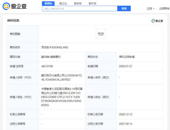 据爱企查App显示,“灵动岛 RADONISLAND”商标已被香港企业爱闪亮日化有限公司申请注册,申请时间为2020年7月,于2021年3月完成注册,国际分类为第28类-健身器材,专用权期限为2021-03-14至2031-03-13。