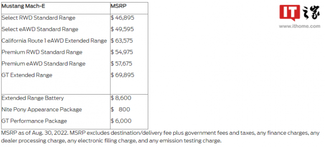 此外,由于福特公布的建议零售价不包括 1200 美元(约 8220 元人民币)左右的交货费,因此用户想要购买最便宜的纯电野马 Mach-E 也要花费近 5 万美元(约 34。25 万元人民币)。
