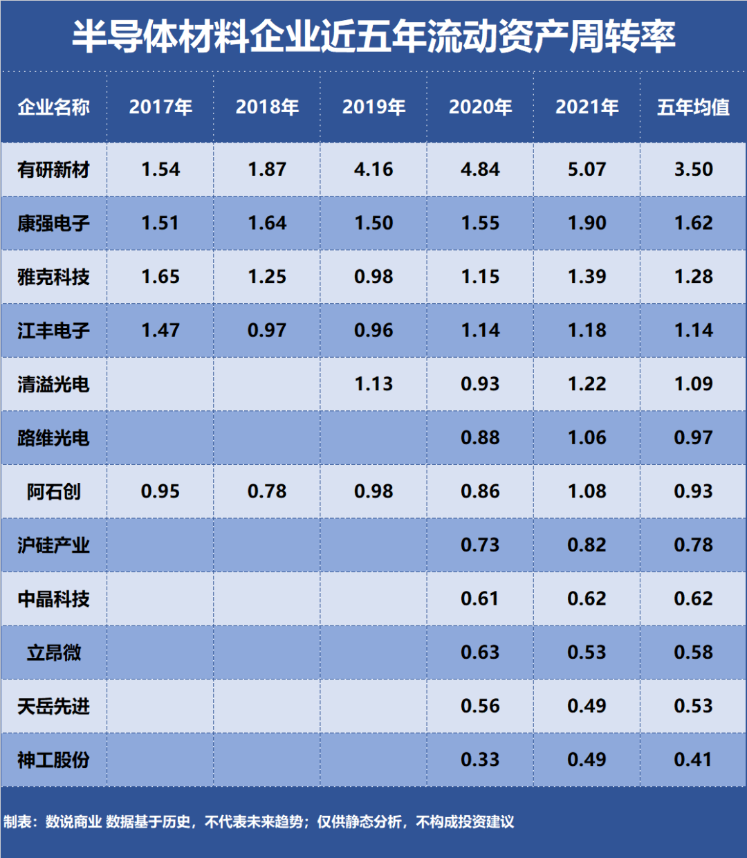 从近五年流动资产周转率来看,有研新材、康强电子、雅克科技、江丰电子、清溢光电等5家企业在1次以上,其中康强电子平均流动资产周转率1.62次。