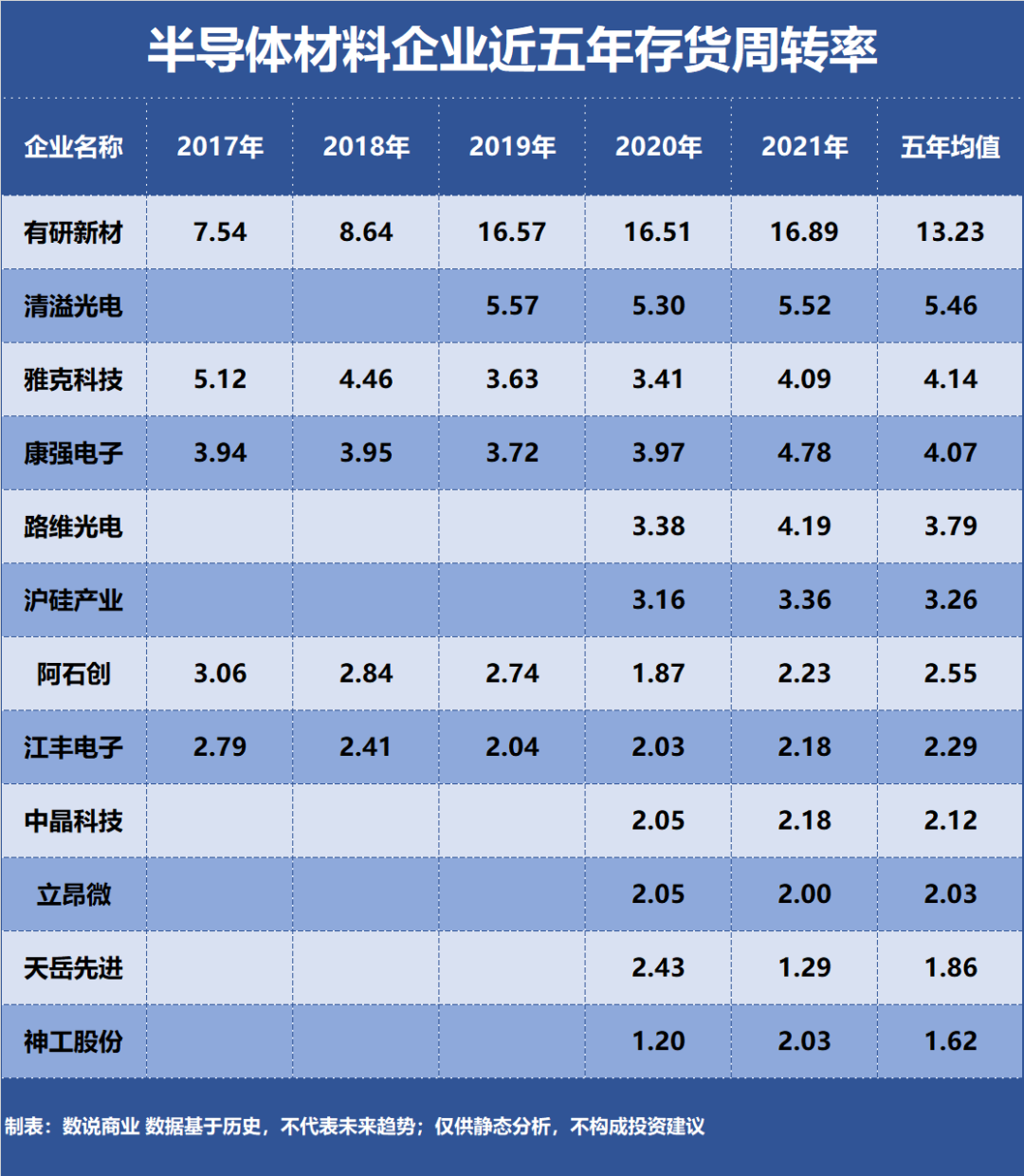 从近五年存货周转率来看,有研新材、清溢光电、雅克科技、康强电子等4家企业在4次以上,其中清溢光电平均存货周转率5.46次。