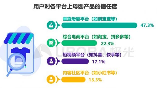 值得注意的是,垂直母婴平台不仅在育儿知识方面获得了用户的高度信赖,在母婴消费方面同样具备强背书作用。极光调研显示,用户对垂直母婴平台的消费信任度高达47。3%,比短视频平台(占比17。1%,如抖音、快手等)和内容社区平台(占比13。3%,如小红书等)的总和还高,垂直母婴平台的专业性和科学性更能直击母婴用户的消费诉求。