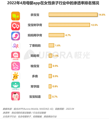 其中,截止2022年4月,在母婴亲子行业中,家庭育儿平台亲宝宝以14。8%的行业渗透率稳居行业第一,成为母婴亲子应用中行业覆盖率最高的APP。