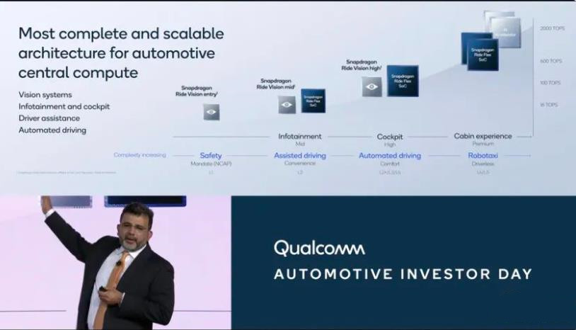 这颗芯片,逼急了高通。于是高通在今天凌晨,也发布了一颗芯片,并称这是“业内首个集成式汽车超算SOC”,名字叫做Snapdragon Ride Flex。