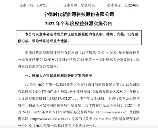 宁德时代:2022年半年度拟每10股派6.528元合计派发15.93亿元