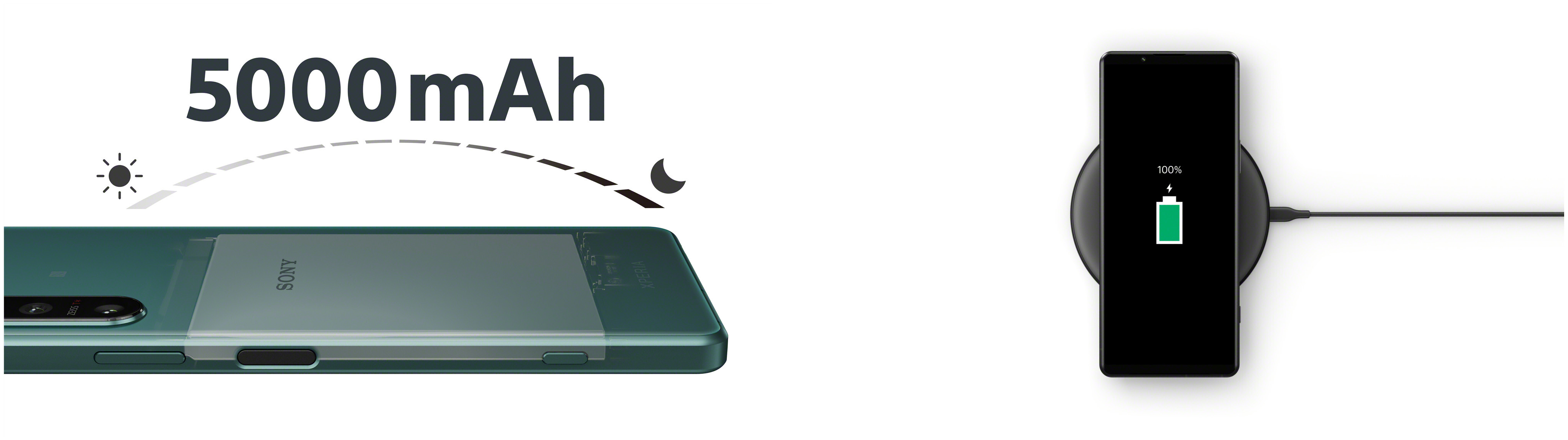 Xperia 5 IV配备 5000毫安时电池容量,电池使用寿命长达3年*6。使用30w有线快速充电可在30分钟内充满约50%的电量*7,支持无线充电和反向无线充电功能,可轻松保持长时间使用。