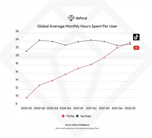 最新研究数据显示,TikTok今年第一季度月人均使用时长达到23。6小时,首次超过YouTube的23。2小时。