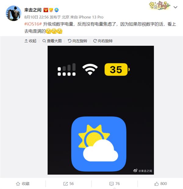 他发文表示:“升级成数字电量,反而没有电量焦虑了,因为如果忽视数字的话,看上去电是满的”。