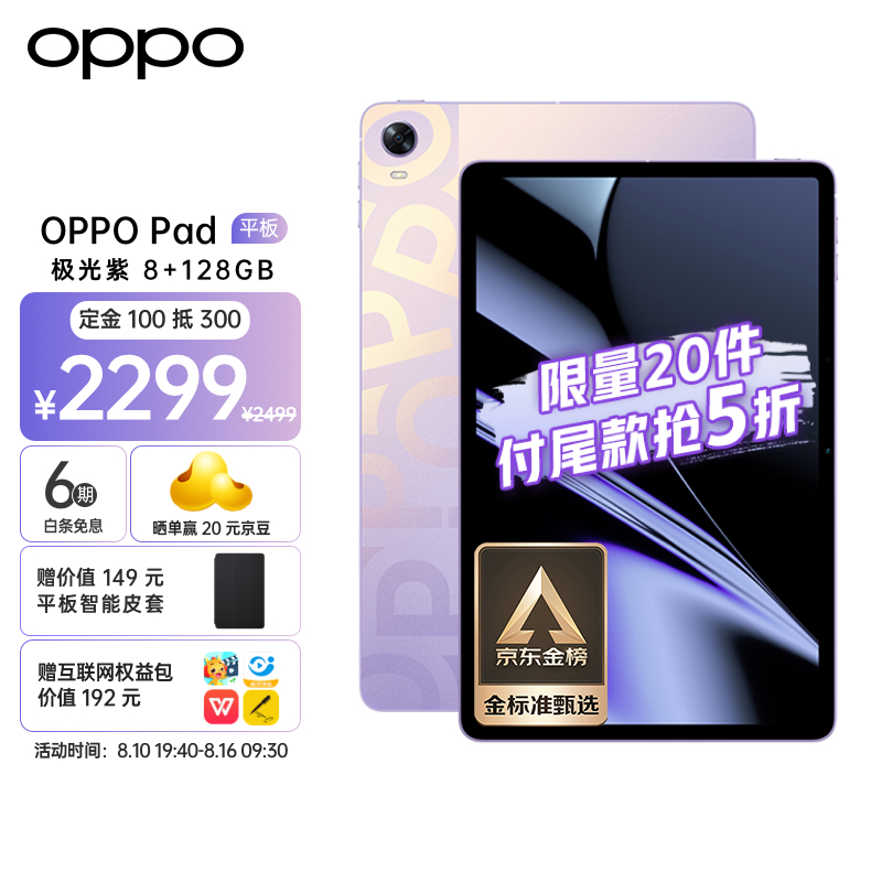 8 月 16 日消息,8 月 10 日晚,OPPO 正式发布了 OPPOPad Air 新配色「紫霞」,同时到来的还有 OPPO Pad 的 8+128GB 新版本,将于今日 10 点开售,首销 2299 元,持平 6+128GB 版本首发价。