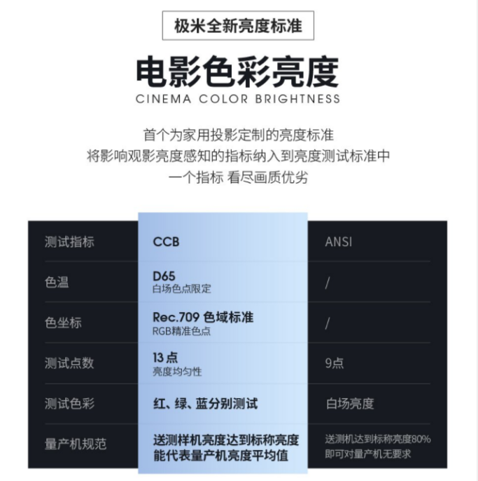 而极米H5采用的CCB亮度标准是把影响色彩表现的指标都纳入到测试标准中,是更贴合家庭观影体验的标准。
