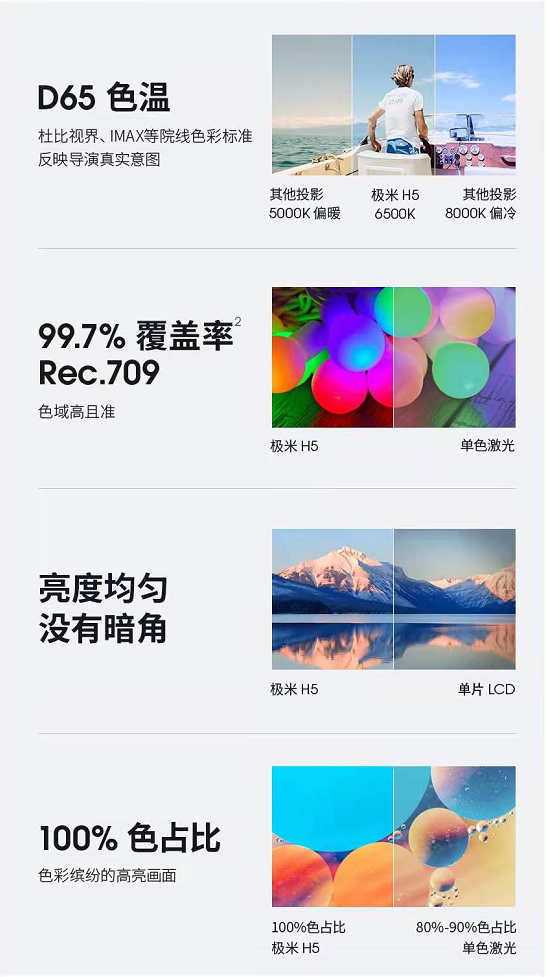 CCB流明的推出具有划时代意义,专为家用投影定制。极米H5作为首个基于CCB流明参数标准生产的智能投影,为消费者带来色彩与亮度兼顾的全新视觉体验。