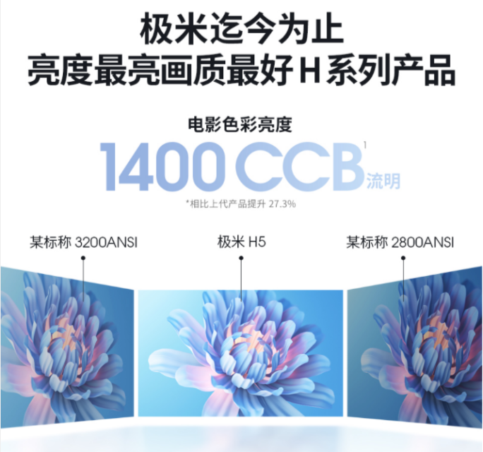极米H5作为首个采用电影色彩亮度(Cinema Color Brightness,简称CCB)标准开发的智能投影,亮度达到1400 CCB流明,其画面表现优于市面上标称3000+ANSI流明的产品。是极米迄今为止亮度最亮画质最好的H系列产品。自研的自研光机-SUPER全色LED系统,持续稳定高亮,兼顾色彩与亮度;全新升级的沙蜥散热系统2。0能带来相较于前代尽2倍的散热能力提升,保障投影运行时更持久稳定,也更加安静。