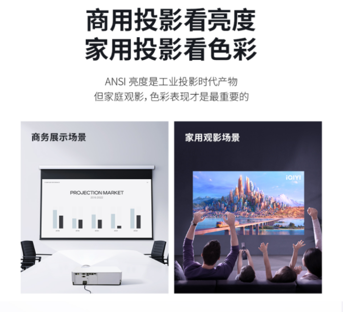 目前国内智能投影的市场标准是ANSI亮度流明参数,但是ANSI流明是工业时代的产物,在现代投影应用场景中就不再适合了。以前商务展示场景下,为了看清楚重要数据等商业信息,故而追求高亮度。现在智能投影已进入家用观影领域,看的清楚不再是唯一指标,色彩表现好不好,能否还原真实画面才是最重要的。