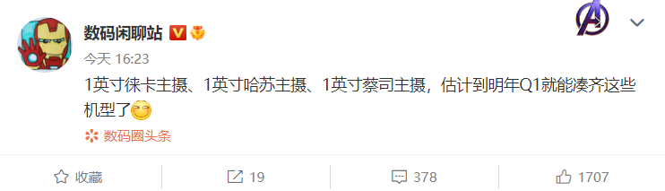消息称明年将有多款1英寸主摄手机发布,分别联名徕卡、哈苏、蔡司