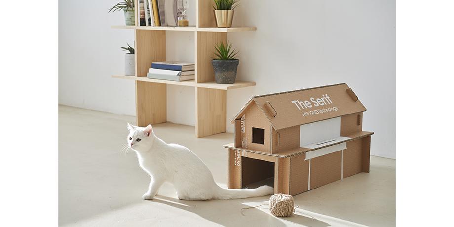 三星电视的产品包装盒由环保的瓦楞纸板制成,并且在表面采用了点阵式设计。用户可以扫描包装盒上的二维码,查看创意改造手册和搭建指导指南,或可以根据个人喜好打开脑洞、发挥想象力,对“包装盒”进行创意改造——宠物小屋、小型家具等等,为生活增添别样的乐趣。