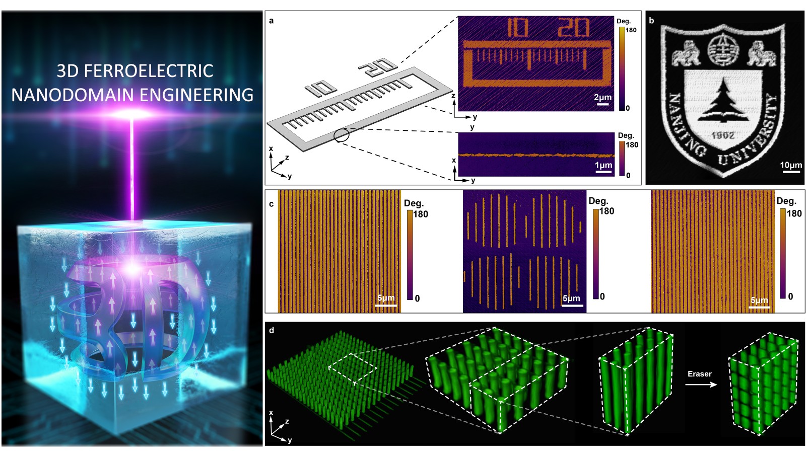 铌酸锂得益于其优越的透射谱范围、非线性光学系数、电光和压电性能,是下一代5G/6G通讯和光子芯片的重要载体。特别的是,在铌酸锂晶体中制备铁电畴结构,在非线性光学、声学滤波器、非易失铁电存储等领域有广泛的应用前景。早在上个世纪八十年代,南京大学的研究小组就采用晶体生长条纹技术在铌酸锂晶体中得到了周期为几微米的铁电畴阵列结构,验证了准相位匹配原理,开启了周期极化铌酸锂晶体(又称非线性光子晶体)在激光变频、量子光源等领域的广泛应用。要进一步提升铌酸锂铁电畴器件的性能,亟需在三维空间实现纳米精度的铁电畴结构可控制备。然而,受限于传统加工技术,该问题一直是困扰研究人员的巨大挑战。