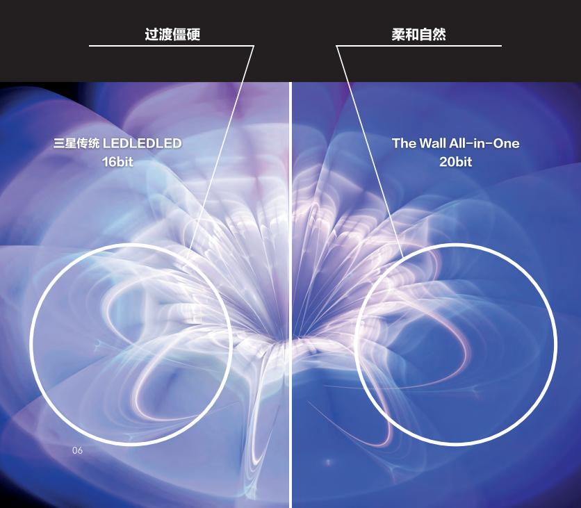 The Wall All-in-One搭载了三星全新的Micro LED芯片,搭配纯黑COB封装技术,可带来纯粹而深邃的黑色表达,使对比度提升至1,000,000!1;纯色度技术则可让窄波长芯片产生的RGB颜色更加精准,色彩纯度达到三星传统LED的2倍。