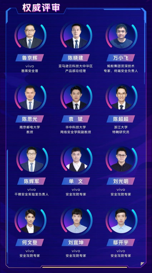 此次“千镜杯”邀请了众多知名企业及知名高校的安全大咖共同组成专业的评审团,包含亚马逊云科技、蚂蚁集团等资深安全技术专家,华中科技大学、浙江大学、南京邮电大学等高校的教授,以及vivo安全攻防专家等,一起为大赛助力。