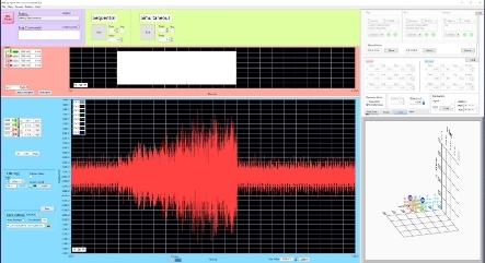 这对Spectrum仪器的 PCIe卡被安装在主控台外部的PCIe机箱中,通过Spectrum的Star-Hub模块进行精准同步。在机箱中备有另外一对相同的卡,可由第一个机箱触发进入操作。这个规模化实验需要在千赫兹范围内使用更高的频率,比在海洋中使用的频率高得多。数字化仪和AWG卡具有16位的高分辨率,甚至可以分别以40MS/s的速率进行采样和输出,而通道之间的偏移小于100皮秒。这为实验提供了极高的精准度。两个UR10e机器人手臂以及信号生成和数据采集,均由一个定制的LabVIEW软件程序控制。该程序由Adam Kingsley创建,被称为“Easy Spectrum Acoustics Underwater”(ESAU)。