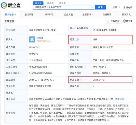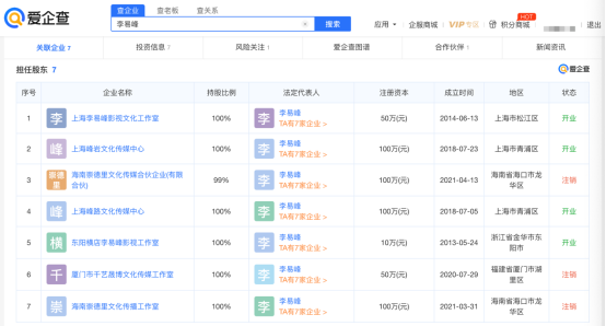 据爱企查App显示,李易峰关联公司共7家,目前仅上海峰岩文化传媒中心、上海峰路文化传媒中心、上海李易峰影视文化工作室、东阳横店李易峰影视工作室,共4家为开业状态且均为李易峰个人独资。值得一提的是,李易峰3家注销状态的企业均注销于今年3月、4月,其中,厦门市千艺晟博文化传媒工作室注销于3月15日,海南崇德里文化传播工作室、海南崇德里文化传媒合伙企业(有限合伙)于4月12日同一天注销。