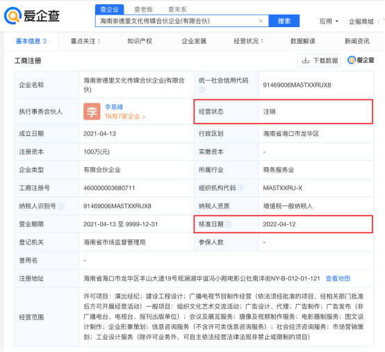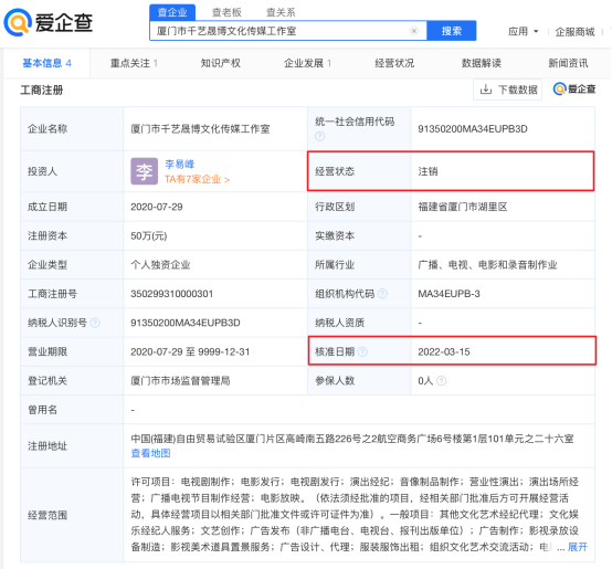 李易峰商业版图盘点:爱企查显示其关联公司7家,今年已注销3家