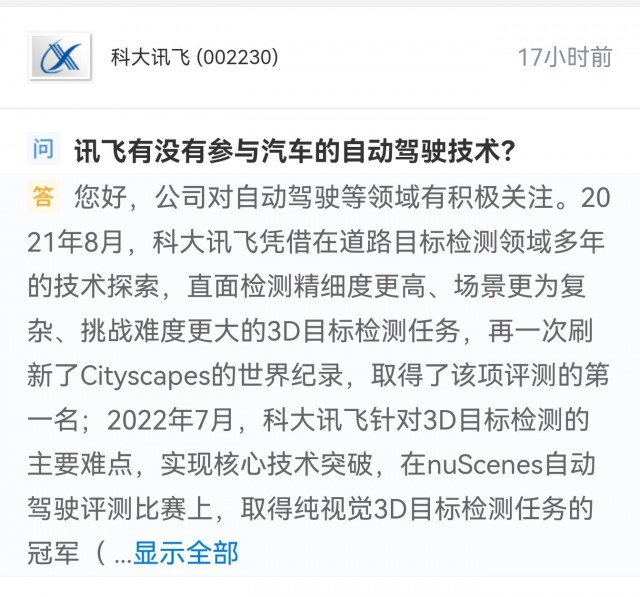 8月14日消息,科大讯飞在回答投资者提问时表示,公司对自动驾驶等领域有积极关注。