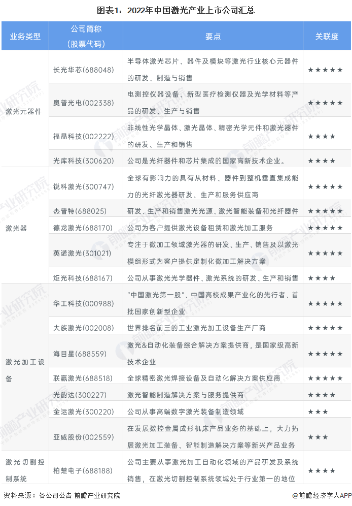 激光元器件企业有福晶科技(002222)、长光华芯(688048)、光库科技(300620)、奥普光电(002338);激光器企业有锐科激光(300747)、炬光科技(688167)、杰普特(688025)、德龙激光(688170)、英诺激光(301021);激光加工设备企业有大族激光(002008)、华工科技(000988)、海目星(688559)、联赢激光(688518)、亚威股份(002559)、金运激光(300220)、光韵达(300227);激光切割控制系统企业有柏楚电子(688188)等。