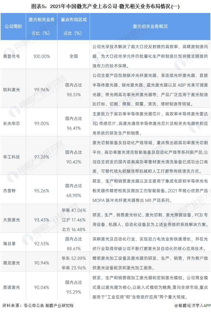 激光产业的上市公司中,上游奥普光电、长华光芯以及中游激光器的锐科激光、华工科技、杰普特几乎全部为激光相关业务,大族激光、海目星、德龙激光、英诺激光的激光相关业务在90%-95%之间,他们都积极拓展激光相关建设全产业链,在各细分领域均有布局;其次是炬光科技、光韵达、联赢激光、柏楚电子,激光相关相关业务布局在80%~90%;在专业细分领域上有较强的市场竞争力;金运激光、光库激光、亚威股份、福晶科技业务布局占公司比重在30%-50%之间,其在各自细分领域中不断提高激光产业的应用比重,未来将会继续拓展激光相关建设业务。除此之外,这些上市公司基本80%-90%的业务比重在国内,还会进行一部分的出口业务。国内方面华东和华南以及华中地区是较为重点的布局区域。