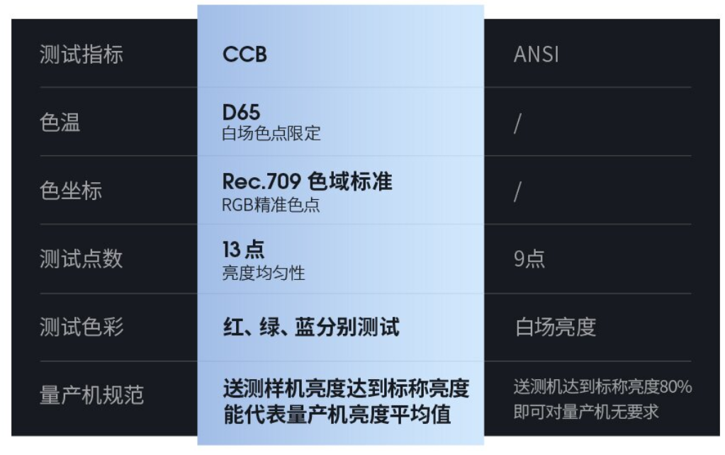 在执行ANSI亮度测试时,为了获得更好的亮度数据,部分产品会牺牲色彩准度,倾向于偏冷的色彩温度,以及将送测机拉到各项极限的方式,然而这样会导致实际量产机可能连标称亮度的80%都达不到,极米将这些关键测量要点纳入CCB亮度标准测试中,让消费者看到CCB测试指标后,就能清晰明了的知道智能投影的画面表现优劣。
