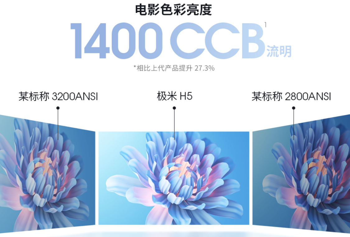 而极米H5作为首个采用极米新亮度标准的机型,不仅是极米迄今为止亮度最亮、画质最好的H系列产品,实际画面也优于市面上标称亮度2800ANSI流明甚至是3200ANSI流明的投影。而目前也有一些声音对极米H5的亮度进行推测,说这款产品的ANSI亮度只有2800,实际上,极米H5的ANSI亮度达到了3300,超过了目前市面上其他品牌投影的亮度。尽管如此,极米仍然选择标注让消费者更容易看懂的CCB流明。