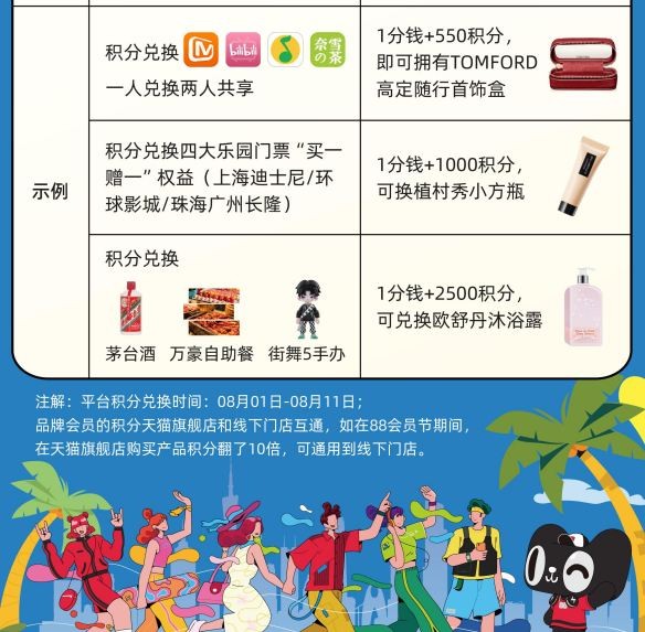 此次88会员节,不只面向88VIP为代表的平台会员,还包括海量的品牌会员。1000家品牌也首次加入,提供了1分钱积分换购TOMFORD首饰盒、植村秀粉底液等大牌福利,让品牌会员能把“积分当钱花”。此外,人头马的livehouse、雪花草莓音乐节等线下活动也向会员开放。
