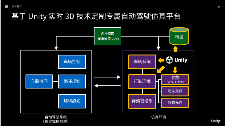 自动驾驶仿真系统的架构主要包括自动驾驶系统、仿真环境和外部数据三部分。Unity可实现车辆行驶场景和车辆系统的虚拟仿真,已同万都就 ADAS 的前置摄像头仿真技术展开了深入合作。