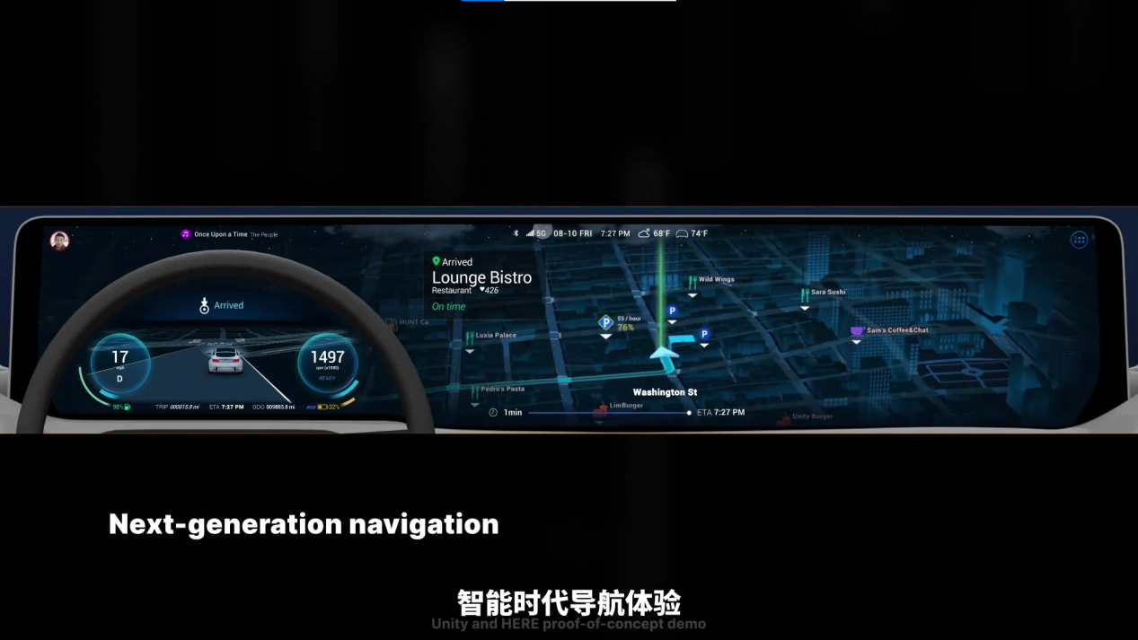 Unity和地图供应商HERE一同创作了高精地图渲染的 Demo,并在其界面设计上实现了丰富的个性化图形效果,目前这一Demo已经跑通于不同性能的车规级和消费级车载芯片。