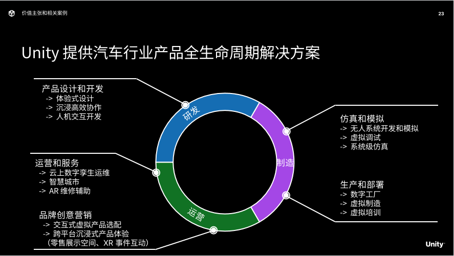 在调研和交流中,Unity发现车企在“新四化”背景下主要面临着个性化、娱乐内容、网联技术、盈利模式等方面的需求。随着新四化进程不断深化,车企需要更多创新性的技术和模式。在此背景下,Unity为车企提供从设计,研发、测试,制造、运营全生命周期的解决方案。