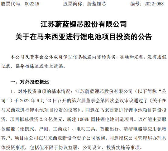 近日,蔚蓝锂芯发布公告称,公司于2022年9月23日召开的第六届董事会第四次会议审议通过了《关于在马来西亚进行锂电池项目投资的议案》,同意在马来西亚进行锂电池项目建设投资,项目拟总投资2.8亿美元,新建10GWh圆柱锂电池制造项目。
