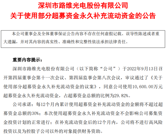 2022年9月13日,深圳市路维光电股份有限公司(以下简称“公司”)召开第四届董事会第十一次会议、第四届监事会第八次会议,审议通过了《关于使用部分超募资金永久补充流动资金的议案》,同意公司使用1.06亿元超募资金永久补充流动资金,占超募资金总额的比例为29.82%。