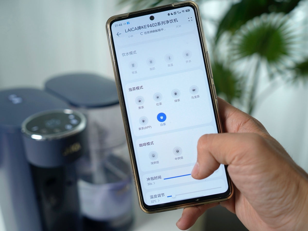 连接手机app后,还能够对黑茶,红茶,绿茶,乌龙茶,黄茶,白茶六大茶种的详细温度和时间编辑,咖啡也有浅、中、深三种烘焙度可选,并且支持温度±1°C,水量±10ml,冲泡时间±1秒任意调节,精准又专业,堪称一台“智能茶饮大师”!