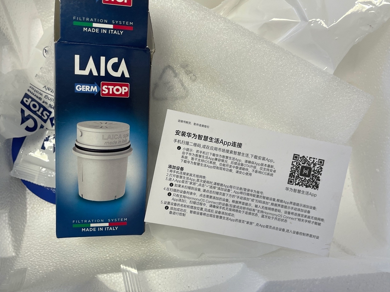 从外包装来看,整体蓝色的设计非常典雅,盒身简洁地介绍了过滤效果和六大功能,值得一提的是,莱卡作为拥有近50年历史的意大利净水品牌,并没有在传统的净水道路上固步自封,而是一直与时俱进,探索着更加科技健康的饮水方式。盒内配件除了茶咖机本体之外,还有滤芯和说明书,还贴心地给出了华为智慧生活APP的下载和连接方法,可以帮助使用者更快上手和使用。