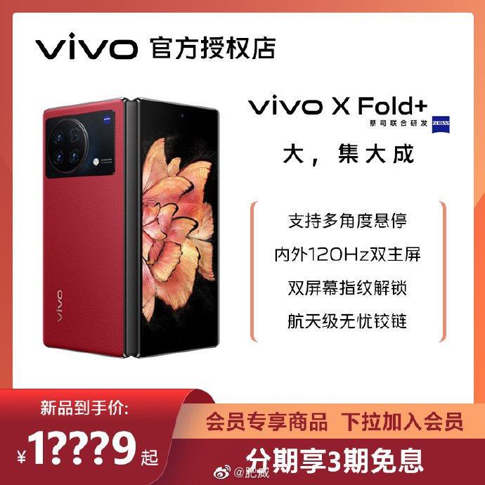 现在 vivo X Fold + 更清晰的渲染图已经,外形和上代相比改动不大,图片中是新的“华夏红”配色。图中显示该机到手价 1???9 起,还提到了新机支持多角度悬停、内外 120Hz 双主屏、双屏幕指纹解锁、航天级无忧铰链等卖点。