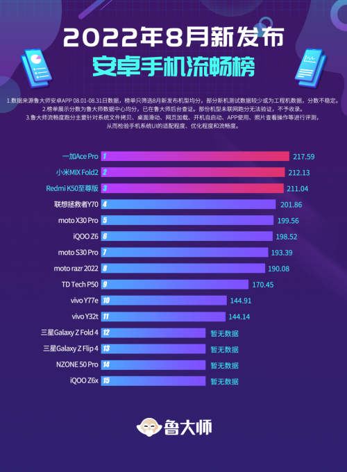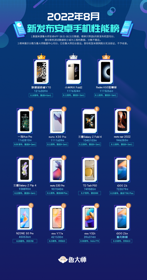 鲁大师数据中心公布了8月安卓新发布手机性能、流畅度排行榜,数据来自鲁大师APP 08。01日-08。31日的数据,榜单只筛选在这期间新发布的机型。部分新机测试数据较少或为工程机数据,分数不稳定。