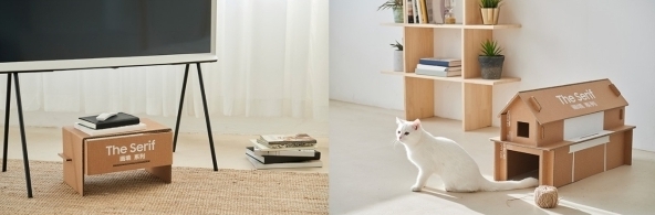 三星不仅仅追求产品的精心设计,更是在产品的延伸——包装盒上巧用妙思。The Serif画境电视的外包装盒采用回收材料瓦楞纸板制作,消费者可以通过扫描包装上的二维码查看创意改造手册,按照指导方法对包装纸板进行自由创意改造,将其变为有趣又实用的家具产品或摆件。由此,你既可以实现废旧包装的环保再利用,又可以通过DIY装点家居空间、增添一份乐趣,将环保理念融入到生活的方方面面。