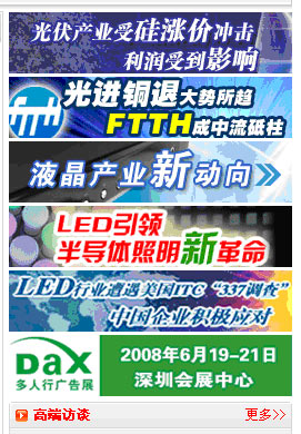 通过光电新闻网一年多的运营,深切的感受到了来自客户的不同需求与抱怨,特别是广告的表现形式与尺寸大小不能完全满足目前广大客户需求,为此,新版光电新闻网的广告系统有针对性的进行了全面升级,不同类型,不同尺寸,不同位置的广告组合达一千多种,涉及文字广告、图片广告、多媒体广告等各种新的广告形式,基本满足了不同客户的各种广告需求。尤其是针对行业特点,在新版首页特别将大通栏广告划分为若干个小型Logo广告位,以满足大多数中小企业的需求,极大的节省了中小企业推广成本与风险。