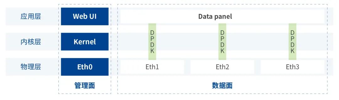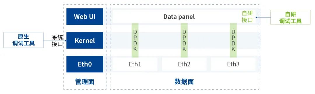 管理面和数据面分离,管理面通过Eth0管理网口,再通过内核协议栈,最后到应用层。而直接影响负载性能的数据面则通过DPDK技术直接接管物理网卡,绕过内核逻辑直达应用层。